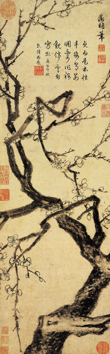 文徵明作为“吴门画派”的掌门人之一,其绘画在明代的影响是有目共睹的。他不但画山水是一绝,画梅兰竹菊也是别有风味。无论从立意构图还是绘画技艺,都是首屈一指的。此图状写曲梅一丛,梅花不多,梅枝却很遒劲粗率,很有气势。画家用浓墨渲染梅枝,用淡墨勾勒梅花的轮廓,使原本洁白无暇的白梅越发显得冰清玉洁,很是高雅脱俗。
