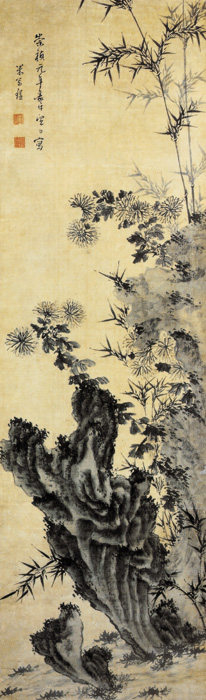 米万钟(1570—1628),字仲诏,号友石、湛园,陕西人,居北京。万历二十三年进士,授江宁令,官江西按察使、太仆寺少卿,米芾的后裔,当时有人将他与董其昌并称为“南董北米”。此图画的是几块湖石边杂生的菊花与嫩竹,布局超逸,用墨浓淡相映,用笔细致工整。两块湖石,其一用墨稍浓而透明,其一用清逸的淡墨画出,勾皴上都有“范宽”的“雨点皴”的笔法。细竹也或以秀逸的浓墨勾染而成,或以淡墨写成,笔法老健秀挺。