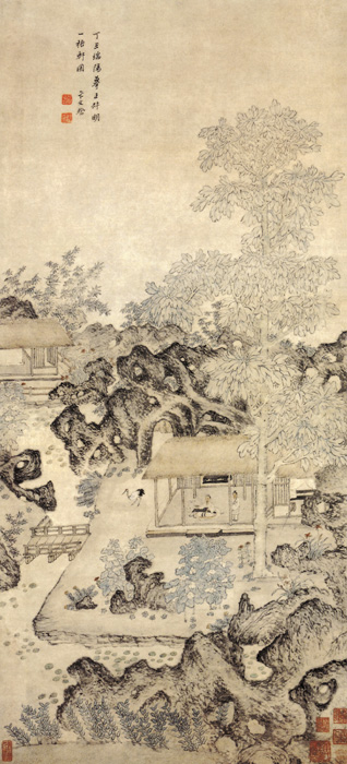 卞文瑜,生卒不详,明末清初画家。本姓徐,后改卞,字润甫,号浮白。江苏苏州人。此画描绘一屋轩及其周围的景色。画中有一座草堂,前有梧桐一株,高高矗立。梧桐树叶勾染精细,枝叶穿插自然得体。勃勃而有生机。屋外一只仙鹤似乎在闻声起舞。院落之中鲜花盛开;草堂四周,湖石环绕,皴法细密,苍劲润泽;左边小桥流水,水上荷萍点点,散落有致。整幅作品在花木的表现技法上多用双勾法,敷色清淡。