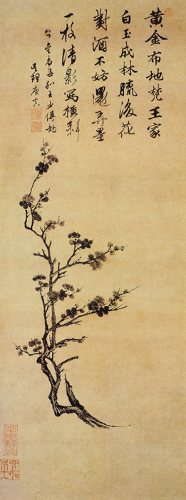此画画折枝梅花,其花用浓淡水墨点成,颇有质感。自题:“黄金布地梵王家,白玉成林腊后花。对酒不妨还弄墨,一枝清影写横斜。公堂看梅和王少傅韵,吴趋唐寅。”唐寅的这幅折枝梅花固然有孤芳自赏自命清高的一面,但整个画面清新的意趣,却给人一种秀雅的美感。唐寅的这幅墨梅,主干虬曲劲挺,用笔潇洒劲健;枝干或斜刺而出,或扶摇而上,苍劲挺秀。梅花疏而有致,错落组织自然,用浓淡的水墨点出,质感传神。