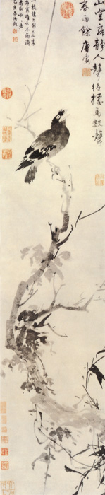 唐寅的花鸟画传世不多,但水平之高却是格外引人注目。他用笔劲健爽利,与林良相近,但精纯洗练,同林的板刻琐碎大相径庭。他用笔苍润秀雅,对徐渭不无影响,然而唐寅的风格灵动清刚,同徐的恣肆和有失狂躁又意趣迥别。此图描绘出空山雨后,鹧鸪歌唱枝头,富有诗意。画面用笔不多,抑扬顿挫、自由洒落,落墨清润华滋、浓淡得宜,技巧精练,表现了他在花鸟画上的卓越才能。