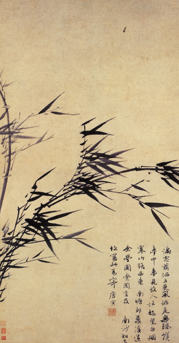 唐寅是一个饱尝了世态炎凉的滋味的画家,29岁时因为科场舞弊案被无辜牵连,蒙冤入狱。家里变得“僮仆据案,夫妻反目,归有狞狗,当门而噬”。画家在给文徵明的信中说:“昆山焚如,玉石皆毁,下流难处,众恶所归,海内遂以寅为不齿之士,握拳张胆,若赴仇敌。知与不知,皆指而唾,辱亦甚矣!”画中迎朔风而傲然挺立的风竹,几乎就是画家所处境况的再现。