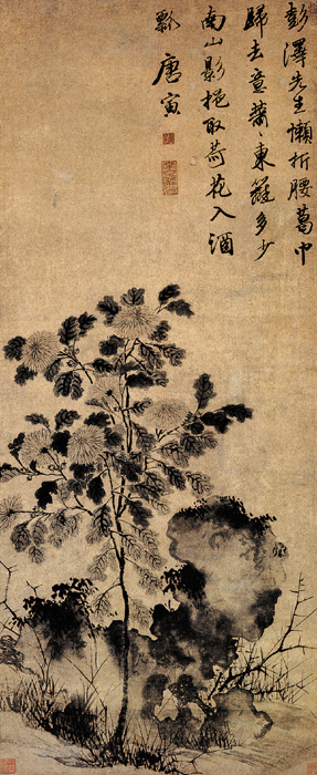 唐寅是一位放荡不羁的旷代才子,在琴棋书画方面均有很深的造诣,尤其在山水画方面,他那才子型的才思敏捷与自由飘逸的思维方式,更是造就了他那潇洒的笔法墨法以及独特风格。画中画家自题:“彭泽先生懒折腰,葛巾归去意萧萧,东篱多少南山影,挹取荷花入酒瓢。唐寅。”点出了画意和画家胸臆。