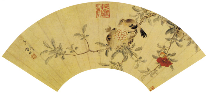 张翀不仅工山水、鱼虫,花鸟也颇佳。在绘画技法上干、湿并重,甚至以运笔豪放洒脱的破笔,使画面达到一种飘逸清朗的意境。此幅《花鸟扇面》描绘了熟透的石榴和正在啄食的小鸟。画面构图简洁明快、却很有几分意趣。画上钤有清代皇帝嘉庆的收藏玉玺。