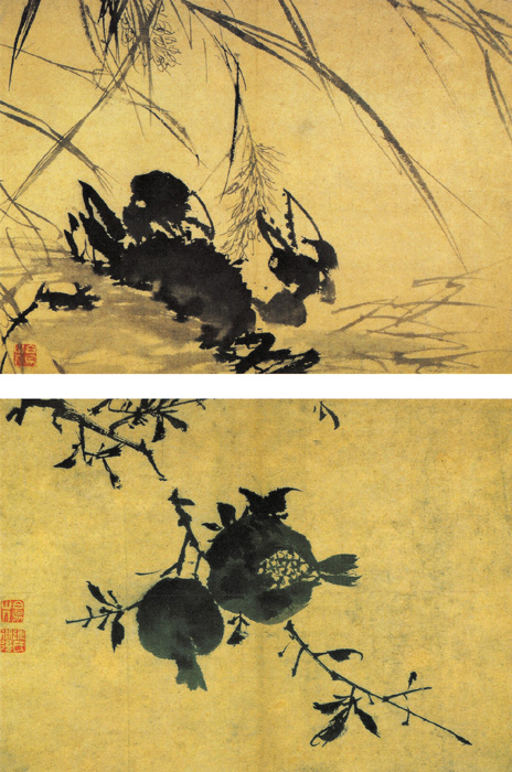 明 陈淳 纸本墨笔 纵28厘米 横37.9厘米 上海博物馆藏 此图册共二十幅,册首有文彭隶书“写意”二字,绘花卉蔬果,水墨淋漓,颇得氤氲之气,是能代表画家艺术风格的花鸟作品。在这些作品中,画家用发挥了水墨晕染的功能,造型洗练,布局疏爽,笔墨放纵率意。有时甚至勾染结合、色墨相融,以追求“逸笔草草”的效果,这无疑是发展了宋元以来文人写意画的传统。在运用写意技法同时,画家还注意到了物象的外形和质感,洒脱中不失准确,放逸中讲求法度,主观感受与物象的天然神韵还是协调的。这与稍后的徐渭有所不同,徐渭的水墨写意花鸟画,则更加追求“不求形似求生韵”的意趣,突出抒发了个人意兴,完全是泼墨大写意的画法。 |