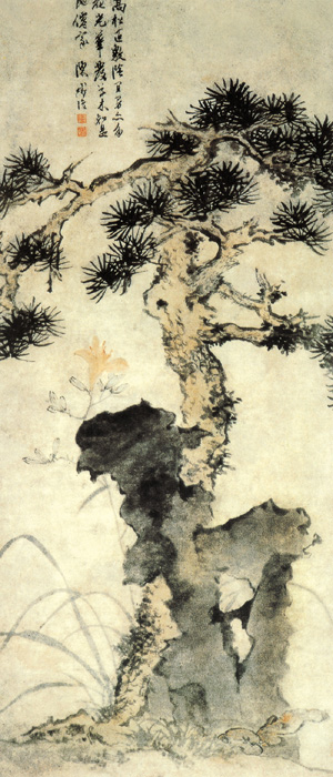 此图描绘的是松树、湖石和萱花。构图饱满,松树用笔苍劲,湖石皴染结合,萱花勾写兼用,画法丰富多变,显示出画家精湛的笔墨功夫。整个画面意韵自足,松树富有气势,萱花形态娟秀飘逸,花朵的圈勾用笔简略洒脱,湖石放笔皴染,浓淡相宜;全图传达出一种清新高洁秀逸的情调。陈淳的花鸟重写意韵,意足不求形似的作风,很自然的得到文人的推重,徐渭赞美他“花卉豪一世”,诚为知音之言。