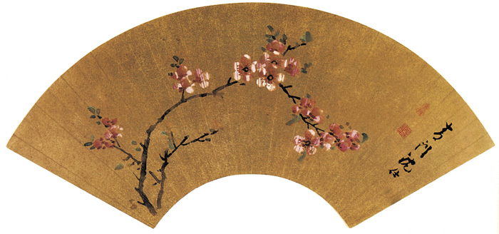 沈仕所绘《花卉扇面》以细笔微染出桃红色花朵,用淡墨勾出的花叶,浓墨绘出虬曲的枝干。突出了花的阴阳向背,兼有元人的简逸之韵和宋人精工之致。
