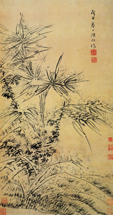 此图描绘一雪中之竹及坡地杂草。画面上一竹直起,枝叶离披,竹下杂生野卉,与竹纠结一起,其下一起伏的缓坡上,亦是细草葺生。竹的枝叶、野卉、杂草及坡地上遍落细碎的雪花。此图笔迹放浪,行笔急爽,而于造物不拘形似,其势亦多不以物相合。如图中之竹,初看不似竹,细看亦不似竹,杂草生长亦多无章,不辨其名。一般画雪,多突出色白,而此图中之雪却独以干笔碎点画出,为黑色,别具一格。