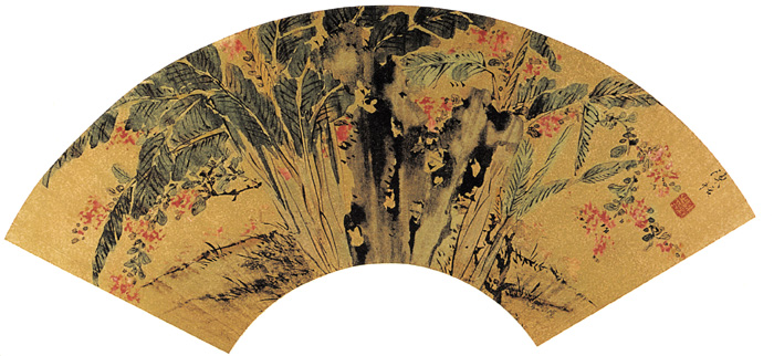 陈栝,生卒年不详,约活动于公元16世纪,字子正,号沱江,长洲(今江苏吴县)人,陈道复之子,嗜酒放浪。画擅花鸟,继其家法,而又出己意,笔致放浪而有生趣,亦能诗。先其父而亡。自元代文人画创立以写法入画以来,明代徐渭、陈道复更在花鸟画中将笔迹放纵的写意画法又向前推进一步,而道复之子陈栝则更在其父基础上,将这种不拘于象的写法又发挥至极致,其勾点皴擦,随心所欲,绝出尘象之外。 此图绘芭蕉紫薇,构图饱满充实,设色浓丽而不流俗。 |