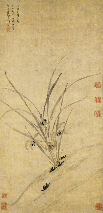 此图仅绘一束兰花。其姿态婀娜,充满生意。兰叶潇洒舒展,穿插有致,花瓣随意点簇,俏丽秀美。叶用重墨为之,花之墨色稍淡,均融入了书法的笔意。其笔势一波三折,有粗有细,有挺有转,有断有续,有收有纵。苍辣老健,变化多端。再加上墨气湿润淋漓,生动地表现了兰草的质感和风韵。