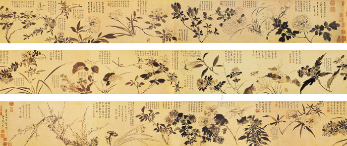 此图所采用的是勾花点叶画法。周之冕善用勾花点叶法,其法简率,富有神韵。此卷墨笔写鸡冠花、芙蓉花、桂花、菊花、水仙花、灵芝、梅花、秋葵等,清雅纯朴,充分显示了画家在绘画上的功力、风趣和特色。周之冕是当时名重一时的花鸟画家,其笔下花鸟生动传神,融合了陆治的设色工致和陈道复水墨写意画法于一体,创立了“勾花点叶派”,促进了水墨花鸟画的发展。《百花图》画风老辣、简括。