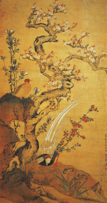 周之冕,生卒年代不详。字服卿,号少谷,长洲(今苏州)人。写意花鸟,最有神韵,设色鲜雅,自成一家。家蓄各种禽鸟,观察其饮啄飞止,故动笔具有生意。此图画奇石兀立,一杏树干老枝遒劲花荣,旁有辛夷伴立;坡有二枝蝴蝶花,迎风招展。有两只锦鸡,一只伫立石端,一立坪地。锦鸡朱腹白羽,尾端上翘,姿态威武,羽毛点染细腻妍媚,生动活泼。《杏花锦鸡图》体现了画家描绘飞禽和花卉的本领。