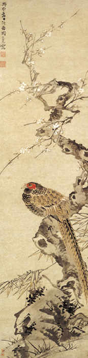 彩绘老干红梅,野雉栖于其上,竹石映带左右。作者周之冕江苏苏州人,善画花鸟,能的其神态;设色清雅,在陈淳、陆治之间,钩花点叶,间出新意。惟酒成癖,诚是一病。此图写生意味颇浓,构图匀称;工笔精细逼真,而无板滞痕迹,正是难能可贵之处。上有作者“丙申夏日汝南周之冕写”名款,下钤“周之冕印”、“服卿”印章二方。