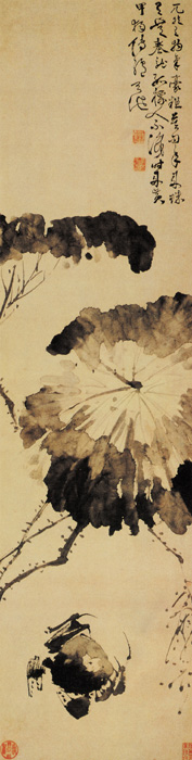 在这幅画上,画家以奔放精练的笔墨写出螃蟹的爬行之状和荷叶萧疏的清秋气氛。此画画在生纸上,作画时在墨中加了胶水,这样可以避免水墨渗散,徐渭时喜用此法。蟹的造型,虽然是寥寥数笔,却浓、淡、枯、勾、点、抹诸多笔法参用,其质感、形状、神态历历具足。覆盖在上面的荷叶,用笔阔大,一气贯成,偃仰有致,在点画之外更具无尽的秋意。