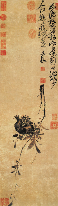 明 徐渭 轴 纸本水墨 纵91.4厘米 横26.6厘米 台北故宫博物院藏 本幅自题:“山深熟石榴,向日便开口。深山少人收,颗颗明珠走。文长。”图绘折枝石榴,郁勃而有姿致,结合自题诗,知是借题发挥,缘物抒情,抒写画家怀才不遇之慨。画家所运泼墨写意法,既痛快淋漓,又富有变化。榴实水墨渲染破壳,信笔点出榴籽,干湿浓淡层次丰富,开口向上的形态简逸传神;枝条以正锋行笔,从上向下运行,笔道由粗变细,在瘦笔中又蕴含破笔与断笔,形成笔断意连、无限伸展的走势;榴叶则随意撇捺,快捷泼辣,灵动飘逸。全图画法粗简恣肆,笔简意繁,形象出神入化,寓意深刻。 |