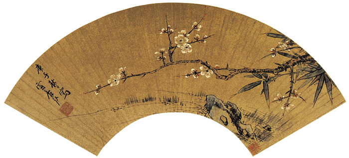 孙克弘当时以画花鸟著名,师法沈周、陆治,兼能工笔和写意。他的花卉有粗细两种面貌:细者,工整清丽,多用勾勒法;粗者,古淡秀雅,笔法率简。这幅《梅竹扇面》,用笔粗简,但又不失工整细致之感,因而此作实际上介于粗、细之间。
