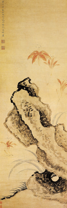 文俶(1595—1634),明代女画家。字端容,吴(今江苏苏州)人。她是文徵明的玄孙女,与丈夫赵灵均一同隐居,怡情山林。她擅长写生花卉,见幽花异卉、小虫怪蝶就信笔点染,她所绘寒山草木昆虫不下千种。她所作花卉皆能曲肖物情,得其生趣,笔墨细秀,皆具绢丽之韵。所绘苍松怪石,也颇为老劲。此画构图疏朗清淡,以干笔勾勒皴擦而成,苍劲枯老。这幅疏淡风格作品虽枯淡而秀润,虽苍老而生意内盈,极富含蓄之美。