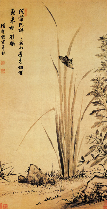 此画描绘了一种十分清净雅致的环境。池水清澈,苇叶劲挺,岩石突兀,水藻浮生,或疏或密,极富生机。画中心有菖蒲一丛,劲健挺拔,长叶如剑,一双蝴蝶环绕于上,随风摇曳,动感生机无限。岸边鲜花怒放,枝叶繁茂,更是生意昂然。画上有项圣谟的自题。画家以淡墨写出菖蒲,笔势遒劲飘逸,隐约可见笔道中的飞白;蝴蝶用浓细的墨线勾画,一丝不苟。菖蒲的写意简括与蝴蝶的工整细致形成强烈的对比,顿使简单古拙的菖蒲变得无比生动自然。