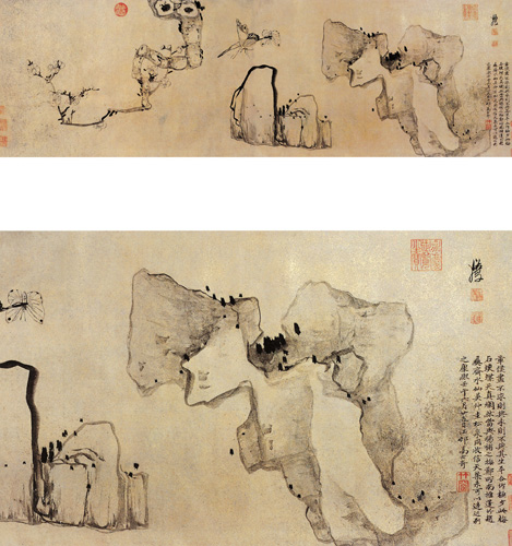 陈洪绶(1598—1652)明代画家,字章侯,号老莲,别号老迟、悔迟、弗迟、云门僧、九品莲花台主者。诸暨(今属浙江)人。幼年聪慧早熟。他的绘画启蒙于蓝瑛。崇祯年间他被召入宫中为舍人,临摹历代帝王像,有机会纵览宫中藏画。此画中心绘一块山石,一对飞舞的蝴蝶,一仰一俯,互相辉映。右方湖石自下而上危立,左方梅枝则倒垂,在左右对称中呈逆向长势,显得别开生面。构图处理新奇独特,寓变化于均衡中。画法则简率古拙,类似减笔画法,是陈洪绶的变体之作。 |