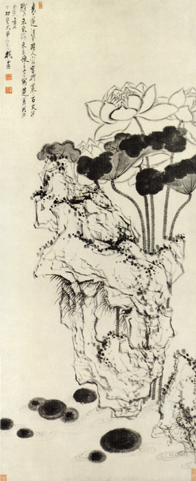 陈洪授人物宗李公麟,躯干伟岸,衣纹圆劲;花卉学宋人双钩,设色雅丽;山水法王蒙,都能自出机杼,独创风格,为明末大家之一。此图墨色变化多韵,写荷塘清趣,幽雅静穆,为具有别调的陈氏佳作。