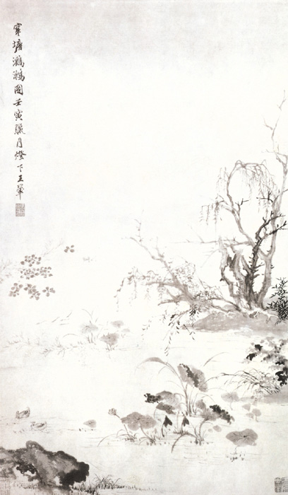 王翚(1632—1717),字石谷,号耕烟散人、剑门樵、乌月山人、清晖老人等,江苏常熟人。祖上五代均善画,王翚自幼喜爱绘画,摹黄公望,几可乱真。王鉴收他为徒, 其文思画艺大为长进。后拜王时敏为师。王时敏极赏其画,乃倾其家藏供他摹习,画艺遂日臻成熟。此图绘寒意逼人的池塘,衰柳、残荷的画法与明代唐寅很相似。画中坡岸上的垂柳与在莲蓬中嬉戏的水鸟相映衬,体现出难得的清新活泼之情趣。