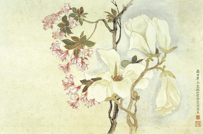 这里所选的是恽寿平的《辛夷图》。身为一代开派的花卉画大师,他更注重生活的体察与观照,从而使他的作品更合乎自然的形态与规律,给人以真实生动的美感。此图以“没骨法”作画,用笔潇洒飘逸,意境秀洁澹雅,传神地再现了辛夷花的动人风姿,是恽氏晚年的精品杰作,较完美地体现并实践了恽寿平所提倡的在继承传统的基础上更应“运以生机,尽造物之妙”的绘画思想。