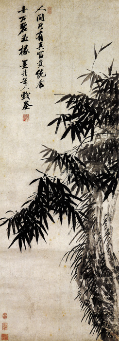 吴历(1632—1718),原名启历,字渔山,号墨井道人,江苏常熟人,清初著名山水画家,与当时“四王”、恽寿平齐名,并称为“四王吴恽”或“清初六家”。吴历求师于王时敏,以卖画为生,晚年入耶稣教,教名西满,曾去澳门。《竹石图》紧靠画面右边画峭石风竹,浓墨点苔,竹叶仅靠墨色的微弱变化来处理。