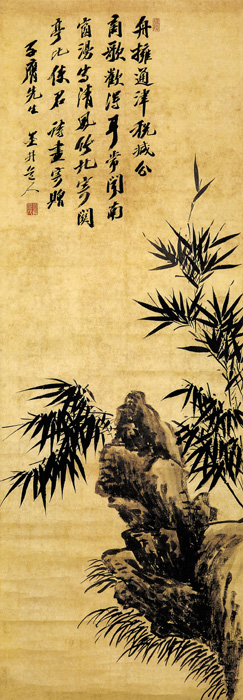吴历的绘画宗法元人,亦上追北宋、兼法唐寅,作品丘壑多姿,笔墨苍浑,风格醇厚深秀,同时也吸取了西画的表现手法,如注重阴阳明暗、黑白对比,构图严谨,具有独特的面貌。浓墨点苔是吴历画竹的风格,此画也一样,墨色浓重的潇竹更是清雅动人。