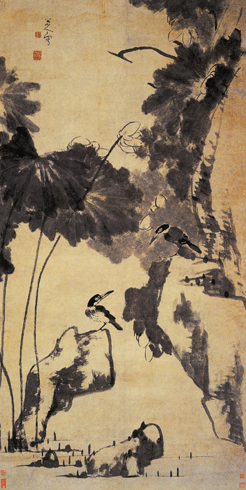 清 朱耷 纸本墨笔 纵182厘米 横98厘米 上海博物馆藏 荷花小鸟是朱耷最擅长也最喜爱的题材。画中荷叶呈即将衰败之势,荷花也将凋谢,两只小鸟则鼓着一双惑眼,四目对注,流露出几多对未来的惶惑和不解……整个画面,墨荷生动,各有姿态,意趣盎然。八大山人描绘荷塘,多是浅水露泥,荷柄修长,扶摇直上,亭亭玉立,具有君子之风。在这幅图中,与莲荷相呼应的左下面画水中露石,组合得当,右部留在画外,用笔放逸,疏秀而具生气。八大山人曾自云:“湖中新莲与西山宅边古松,皆吾静观而得神者。”可见其画荷是观察入微,静观悟对而以意象为之,信手拈来,妙趣自成。 |