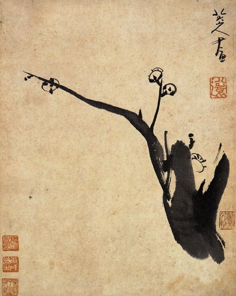 画上签署的落款为“八大山人”,看起来却像“笑之”。表明了画家作为明代皇室后裔对清政府的一种不从和嘲讽心态。仅绘一枝梅,仅有四朵梅花在梅枝上很孤立地绽放,揭示了画家的孤独心理和落寞的心态。