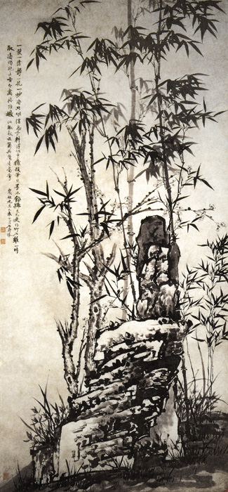 这是一幅能代表画家艺术风格的作品,竹叶梅花画法奔放自如,墨色浓淡相间,并富有层次。石头画法也简率放逸,形象洗练,造型夸张。整幅作品,意境空灵,余味无穷。 “一叶一清静,一花一妙香。只些消息子,料得此中藏。……”画面诚如石涛自题,清香四溢的花卉隐逸于树干竹叶间。