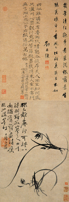石涛在笔墨、意境上都超出前人,不拘一格,独具特色。他曾有自题:“此某家笔墨,此某家法派,犹盲人之示盲人,丑妇之评丑妇尔。赏鉴云乎哉?不立一法是吾宗也,不舍一法是吾旨也。”言明了他学前人却绝不拘泥于前人、锐意创新的决心。这幅画是石涛的代表作,从中我们可以领略到石涛极富独创性的风格。上有大涤子自题和诸家题款。仅绘“幽谷谁怜王者香,两枝情态各低昂……”的兰花。