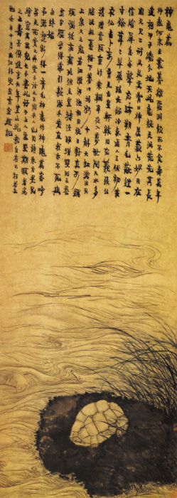 蔡嘉,生卒年不详,字松原,一字岑州,号雪堂,一号旅亭,工诗文,善花鸟、山石,尤擅青绿山水。长年寓居扬州,与扬州画派神交颇深。此图构图重心偏下,一片汹涌水浪中微现一孤石,石上一龟,身体缩入甲内,颇有不顾外界任何风云变幻的从容。石畔水草丛生,被风吹得倒向一边,凸现出气氛的凌厉,更反衬龟之安祥。画面上端是金农行书《神龟篇》全文,占去了小半画幅,使原本简练的构图免了单薄之虑,显得十分得体而多姿。
