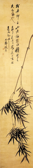在竹子的画法上,竹干笔法略如“竖为努”,画竹节“点为侧”,竹枝参以“勒”、“啄”、“策”、“趋”,灵活运用。竹叶多用“永”字左下的“掠”和右下的“磔”,一笔一笔撇捺,既有力而又含蓄。疏朗但厚实圆劲是此幅作品中画竹的特色。画上自题:柯丹邱云此法极难非积学之久不能也。此画写倒挂竹一枝。浓墨写竹叶、竹竿,不加渲染,可见画家笔法之深邃和灵动。