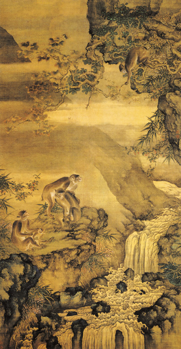 清 沈铨 绢本设色 纵184厘米 横96.9厘米 北京故宫博物院藏 此图描绘深山薄雾笼罩,一株古柏生于崖石旁,枝间藤萝绕垂,藤萝缝隙的蜂巢周围,成群的黄蜂嗡嗡聚集。这种奇特的现象和声音吸引了树上的小猴,它攀住枝叉,俯身去抬栖憩在树叶上的蜂翅,神态专注。它的大胆举动令树下的同类惊恐不已,它仰望着蜂群,高举前爪,作出随时准备自卫的架式。而在草藓上的猴子则不以为然地看着它们。三只猴子的画法极其工致,先以极细的线条勾勒轮廓,再渲染上浅赭为底,而后一笔笔丝出动物的毛皮,纤毫毕现,很富有立体感。 |