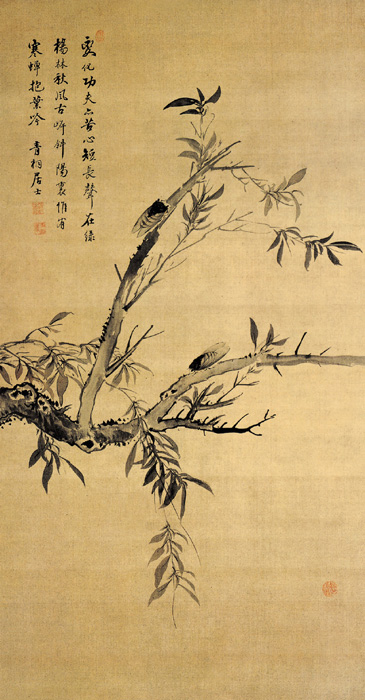 蒋延锡(1669—1732),字扬孙,一字酉君,号西谷,一号南沙,别号青铜居士,江苏常熟人,工花卉,大都为逸笔写生。官至大学士,谥“文素”。画面为自左向右延伸之柳树,上有双蝉,用笔细致,风格写实,体现的是一种野趣,自题之诗则加了一层力度,诗云:“变化工夫亦苦心,短长声在绿杨林。秋风古岸斜阳里,惟有寒蝉抱叶吟。”墨中带赭是不常见的风格,也是蒋画的一个重要特点。其用笔简逸,类似写意,但细细观之,尽得柳、蝉之神韵。