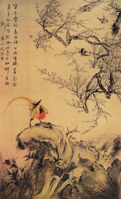 华喦(1682—1756),字秋岳,号新罗山人、东园生。福建临汀人,后寓杭州,善书,工画人物、山水、花鸟,为清代杰出的花鸟画大家。此画绘一株梅树上下两只小雀嬉戏场景,既优美雅致,又别致可爱,是极难得的意、趣双全作品。画面梅树自右而起,向左上方延伸,树干崎岖,枝桠刚劲,树上所生之淡淡花朵却极尽柔媚妍丽之态,树上栖一只小雀,神情稚嫩可爱,敷蓝黑色,树下亦有一只,昂首观望,专注而若有所思,一上一下两只小生命更添了画的情调意趣,显得生机盎然。