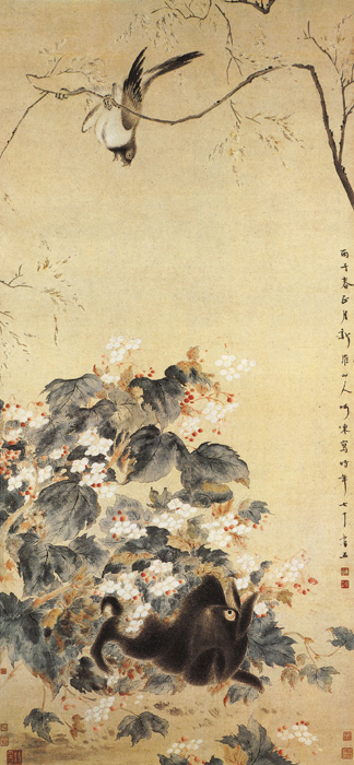 此图以“没骨法”写大片盛开的秋海棠,密而不乱,层次丰富。用细笔勾勒筋脉,顿挫有致,清晰可辨。画家对于水份可以巧妙自如地加以控制,使花叶显得愈加通透、青翠。花瓣以白粉点出,莹洁醒目。工笔描绘花间黑兔,使工与写、黑与白之间形成多层次的强烈反差,牢牢吸引住了观者的视线。