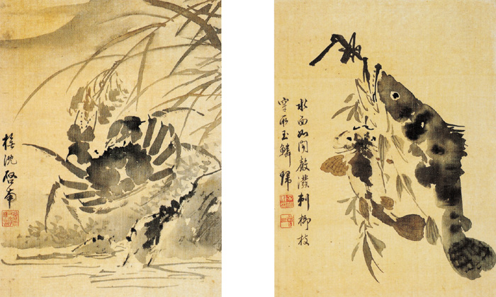 余省(1692—1767),字曾三,号鲁亭,江苏常熟人,从师花鸟画家蒋廷锡,乾隆时祗候“内廷”,善画花、鸟、虫、鱼,尤善画蝴蝶。余省作画时参用西法,赋色妍丽。《杂画册》属水墨写意,画牡丹、玉兰、花蜂、桃花小鸟、荷花翠鸟、稻蟹、竹石兰花、松鼠葡萄、鳜鱼、松梅、佛手、水仙香椽等十二开。这里所选的稻蟹、鳜鱼二开,用笔豪爽,挥洒自如,用墨酣畅淋漓,豪放中呈现秀雅。法随意转,形中见神,意态生动。