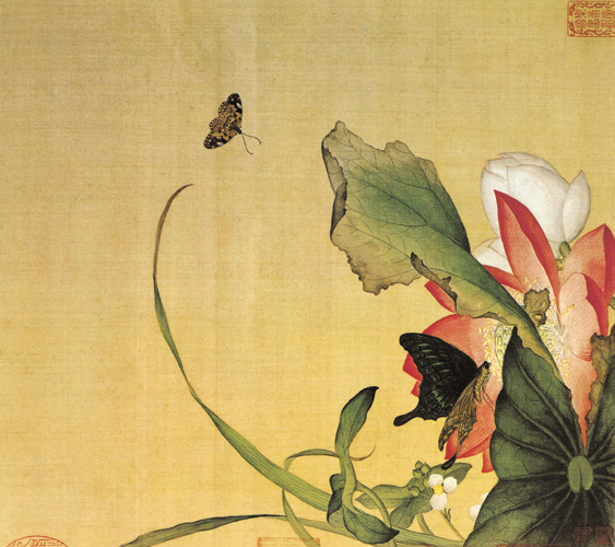 清代美术史家胡敬在《国朝院画录》中记载:“世宁之画本西法,而能以中法参之,其绘花卉具生动之姿,非若彼中庸手之詹詹于绳尺者比。然大致不离故习,观爱鸟罕四骏,高庙仍命金廷标仿李公麟笔补图,于世宁未许其神全,而第许其形似,亦如数理之须合中西二法,义蕴方备,大圣人之衡鉴,虽小道心审察而善终两端焉。”《花鸟图》所绘花卉,画法精工,设色艳丽。