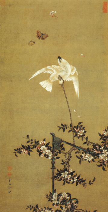 胡湄,生卒年不详,字飞涛,号晚山,又号秋雪,浙江平湖人,自幼受到古代绘画艺术熏陶,画风追宋人笔意,善画花鸟虫鱼。此画亦为仿宋人笔意而作,绘一枝繁花密集的花枝,几朵落英飘落,一双蝴蝶逐花而舞,而树枝上的架中鹦鹉又翻身飞下,扑向蝴蝶,却被铁链绊住,显出满心的无可奈何之状,真可谓“气韵生动”。整幅画面无有懈笔,架上驳离的锈迹、飘飞花瓣的质地,都刻画得极为真实,鹦鹉的白羽乌喙亦显得十分传神,分外美丽。