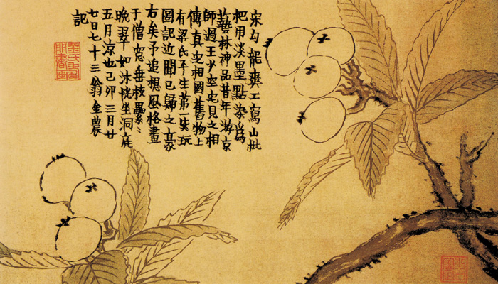 金农(1687—1764),字寿门,号冬心,又号司龙、稽留山民、昔耶居士,仁和(今浙江杭州)人,寄住扬州。此《花果册》全册十开, 这里选了一幅枇杷图。绘有成倚角之势的二组枇杷, 高矮对比,在造型上有一种工整的优美感。
