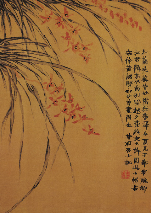 画上有画家自题:“红兰花叶皆妙,惜无香泽,今夏见于奉宸院卿江君鹤亭水南别墅,越夕,费燕支少许,图此小幅。若宋徐黄诸贤却未曾画得也。昔耶居士记。”画罕见的红兰花。笔触较工整细腻, 风格沉着又清丽, 笔墨稚拙,不求形似,别具古朴风格。