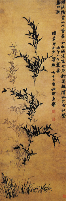 金农50岁后始学画,善画山水、人物、花卉、梅竹。金农也工诗文、书法,精鉴别,是著名的“扬州八怪”之一,著有诗集《冬心诗集》。此画绘兰花修竹,画风简淡清丽。画上有画家自题:“雨后修篁分外青,潇潇如在过溪亭。世间都是无情物,只有秋声最好听。七十六叟杭郡金农。”足可昭示画家当时的心声。