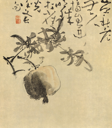 黄慎(1687—1765),字恭寿,号瘿瓢子,福建宁化人,为“扬州八怪”之一,擅长人物、山水、花卉,用笔酣畅,纵横驰骋,极尽变化。他从唐代怀素的草书中体会到其用笔的绝妙之处,便把草书的运笔用到绘画中去,创立了自己的风格。此幅《石榴图》就是用草书笔法写成,别有韵味。