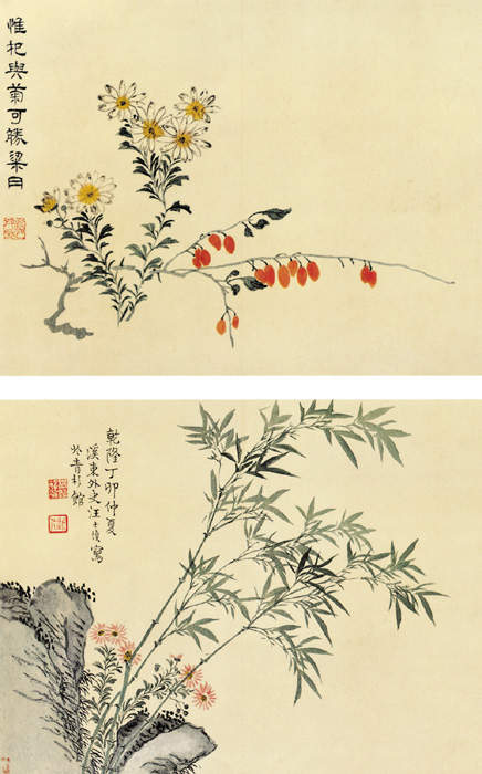 浅色画花卉八开,装为一册,选印菊、修竹各一开。 汪士慎擅写生花卉,晚年失明,犹为人作画不已。与金农为诗画友,同为扬州八家之一。此两图格调清新,得写生妙法,近恽寿平一派。作于清乾隆十二年,时年62岁。