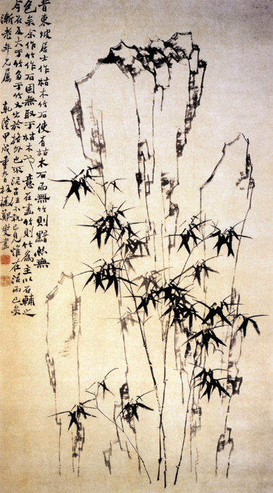 清 郑燮 纸本,纵120厘米 横69.3厘米 墨笔 画面构图居中,画新竹二竿,竹后二方石块挺立。略有明暗前后关系,竹叶在前的用色浓重清晰,在后的则以略淡之墨完成,更为退后的是石块,用色更加浅淡,完全是竹子的陪衬,但并非草率马虎之笔,细观之仍是苍劲奇峻之笔。题款位于画之右上方,字体别致妍丽,跌宕多变,抑扬顿挫中体现出一种音乐的多变旋律感。画中共钤四印,三方位于题款之后,二朱文,一白文,白文印章云:“七品官耳”,是郑板桥印章中极有代表性的一方,一直为人所津津称道。另一方钤于画面左下角,呈压阵之势,小而有型,造型别致怪异,为略具山形,亦是印之精品。 |