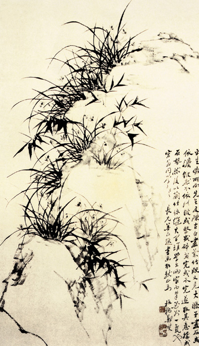 画面内容是石畔青竹,石缝中并生兰草,右前生竹三竿,老竹苍劲挺拔,新竹俏丽清秀,各有特色,落于纸上气韵生动,虽是寥寥几笔写意而成,而竹之神、竹之态、竹之韵已被表达得淋漓尽致。竹所倚生石块亦是画面主体之一,作为竹之背景,以遒坚奇峻之态增添画之气势,又反衬竹之生机;石上兰草则增添了石趣,不给人顽固古板之惑,反觉石亦为可亲可爱之物,也有它的生命喜好。从题跋看,这是作者送给老者寿辰之礼,以充满生气的题材作画,再配上不无幽默的题诗,真是再恰当不过了。