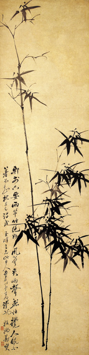 郑燮在“师承自然”的同时并没有忽视学习传统,而是继承了宋元以来文人画的表现形式,特别是对文同、郑思肖、徐渭、朱耷、石涛,更是仔细研磨。他画竹时,不喜勾勒着色,多用墨笔,将精湛的书法用笔与画兰竹的技法融为一体。此画画竹两竿,画上有画家自题:“轩前只要两竿竹,绝妙风声夹雨声。……”