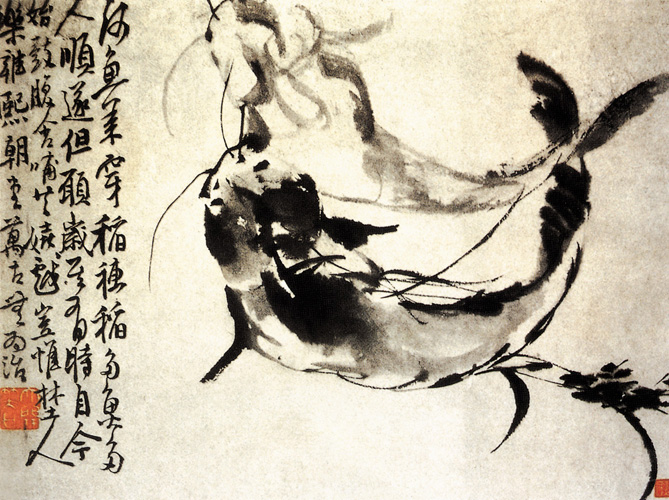 《鲇鱼图》绘两条鲇鱼, 运笔洒脱, 以浓墨绘鱼背, 淡墨绘鱼肚, 一正一反, 一浓一淡, 生动地描绘出了鱼之肥美鲜活之态。上题诗:“河鱼一束穿稻穗, 稻多鱼多人顺遂, 但愿岁至可日时,自今始, 鼓腹含哺共嬉戏, 岂唯野人乐雍熙,朝堂万古无为治。”